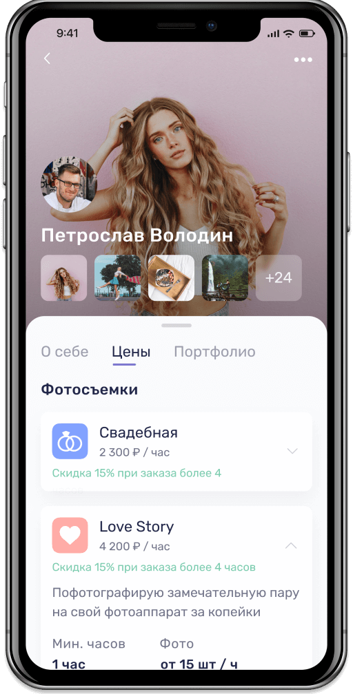 На странице фотографа сразу понятно, что он за профессионал по портфолио, которому уделили действительно много места – это гораздо удобнее чем на других сервисах по поиску исполнителя